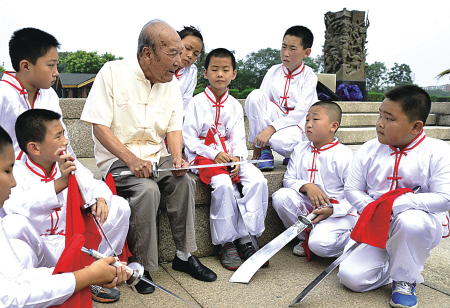 9月1日,在位于北京市丰台区的中国人民抗日战争纪念雕塑园内,居住在卢沟桥宛平城并亲历抗日战争的老人郑福来给孩子们讲述抗战往事。