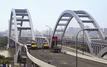昨日,四川路桥公司施工车辆在芝兰桥摊铺桥面降噪沥青。横跨奉化江的芝兰桥是环城南路快速路节点项目,采用中承式系杆拱桥,全长370米。目前,全长9.2公里、总投资27.3亿元的环城南路快速路工程建设已近尾声,计划在下月底建成并通车。(胡建华 王岚 焦成 摄)