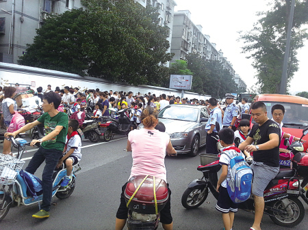 | 图为昨天下午放学时的接送场景。(沈孙晖 摄) |
