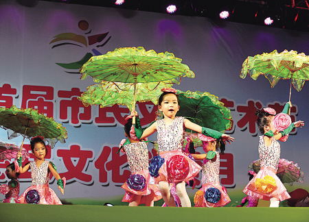 | 昨晚“文化夜市”赶集活动上,七色花艺术团的小朋友在进行文艺表演。 |