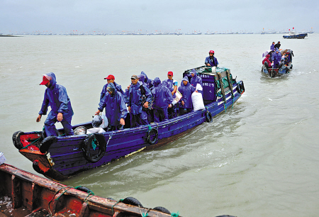 昨天上午9时20分,一批渔民正在奉化市莼湖镇桐照码头登岸。截至下午4时,该镇9150余名海上作业人员全部安全撤离。