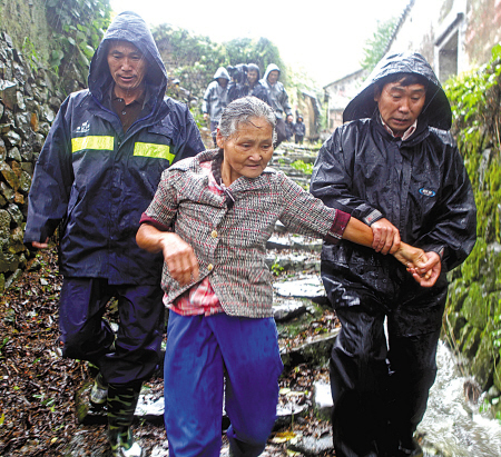 昨天下午1时30分,奉化大堰镇南溪村60岁的汪亚娟在镇村干部劝说下离开原住处。当天,该镇50多名联村干部全部到各村指导、帮助抗台工作,并从中午起全面转移地质灾害点和住在危房里的群众,全天共撤离群众600多人。