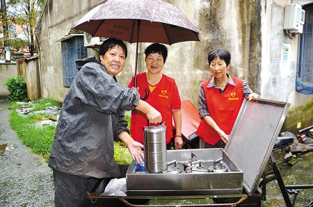 厉晓杭 陈红 金旭孟 昨天上午,北仑区新碶街道紫荆社区防台应急服务队成员来到卫生弄32号王阿婆家,为其送上热腾腾的饭菜,并叮嘱老人不要外出,关好门窗,还仔细检查了老人家中的电路、煤气等设备。 王阿婆今年83岁,一人独居,由于老房子地势低洼,一刮台风就积水。志愿者提前把她家的贵重物品搬到高处。看到雨下得很大,志愿者又上门提醒老人注意安全。“年纪老了不管用,眼花耳聋的。每次台风来了,就全靠这些师傅来照顾我。”王阿婆对志愿服务队赞不绝口。 新碶街道紫荆社区是北仑区“最老”的社区,社区里居住着不少像王阿婆一样的独居、高龄老人以及残疾人家庭。“每次台风来了,居民的安全是我们最担心的。”紫荆社区居委会主任王春风说,除重点关注危房住户外,独居老人和残疾人家庭也是居委会担心的对象。为此,社区专门成立了一支由20余人组成的防台应急服务队。不少队员有一技之长,木工、水电工都有。每到台风天气,服务队成员兵分多路,除了对危房和低洼地进行排查外,还挨家挨户地通知老人和残疾人做好防台准备,提醒他们不要外出;帮助独居老人检查门窗、室内电路、炉火、煤气等设施,做好各项防御准备;如有需要采买的物品,由社区居委会或志愿者代买送上门。 对于行动不便的老人和残疾人家庭,服务队队员还送餐上门。昨天上午11时,服务队成员将热腾腾的炒花菜、玉秃鱼、豆腐汤等饭菜送到了贺德芬老人家。贺德芬患类风湿关节炎多年,每天的午饭和晚饭,都是社区居家养老互助中心提供,由服务队队员帮忙送。吃着可口的饭菜,老人感慨:“风大雨大,志愿者的关心却不断!”