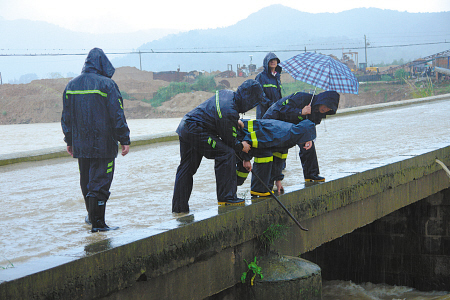 昨日一早,宁海跃龙街道会同县公路管理局迅速组织50多名机关干部和水车上园自然村党员干部,用钢筋、木棒全力疏通水车村上明桥桥面上130只泄水孔,很大程度减少了桥面的积水。