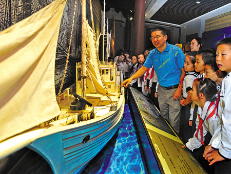 日前,在我市首个世界文化遗产点———庆安会馆,“海商文化讲师团”成员黄定福副研究员正在该馆开设的首期海商文化讲座上,向行知实验小学学生和社区居民介绍我市商人在清咸丰年间从英国引进的我国首艘铁壳蒸汽动力轮船———“宝顺轮”的历史。当天,由市文广新闻出版局和江东区政府联办的“走近海商”之世界文化遗产看庆安活动在庆安会馆启动。(严龙 张绘薇 胡勇 摄)