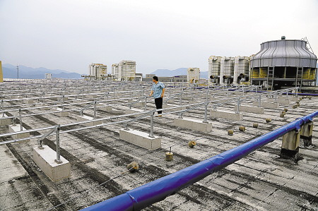 | 图为海伦钢琴屋顶分布式光伏发电项目已完成太阳能电池板支架安装。(记者 张跃 摄) |