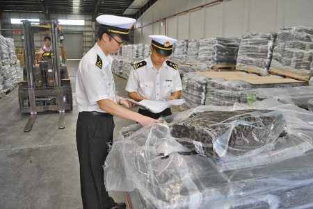 图为梅山海关关员正在四海物流公司仓库检验进口橡胶。 (记者 谢挺 摄) |