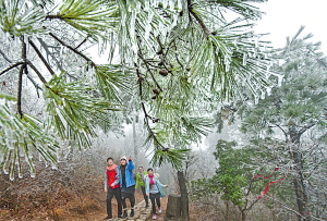 昨天下午,一群游客正在四明山国家森林公园深秀谷观赏满山的雾凇。受连续降温及山区留存的暖湿气流共同影响,从昨天凌晨起,四明山区的仰天湖、深秀谷、鹁鸪岩等海拔较高的景区,出现了蔚为壮观的雾凇奇观。据公园负责人介绍,近日有利的天气条件,四明山区极有可能连续多日发生雾凇。(严龙 方国栋 摄)