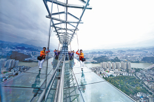 12月5日,位于广西柳州市地王国际财富中心七十六层的云顶观光项目正式开放。该项目占地面积388平方米,是集旅游、观光、游乐为一体的城市高空景观旅游景点。其中,空中透明玻璃栈道位于云顶观光层的外围,总长208米、宽1.5米。游客栈道体验为“5+2”模式,即每次5位宾客和2位安全教练一同完成体验,时长约30分钟。据了解,这是全国第四家、广西首家户外玻璃观光栈道。