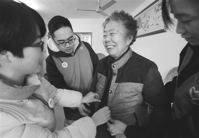 昨天,鄞州福明家园社区“先锋e号”志愿者把新购买的新冬装送到85岁的刘淑兰老人家里。春节之前,志愿者们将为80岁以上的老人赠送一件新冬装,送去冬日暖阳和新春的祝福。 记者 丁安 通讯员 樊芸菠