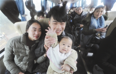 本报讯(记者 边城雨 贵州都市报记者 赵惠 文/摄) 前天上午9点,50多名在余姚工作的来自贵州省毕节市纳雍县中岭镇的务工人员,踏上了回家的路。与往年不同的是,他们乘坐的是老家有关部门组织的免费大巴。 记者在现场看到,这些务工人员不少都扶老携幼,虽然天下着雨,但是人人都很开心。“今年没有买到车票,正为回家的事发愁,没想到老家派车来接我们回家过年。”在余姚务工的赵师傅高兴地对记者说。 一名姓王的务工人员告诉记者,他有13年没有回家过年了,因为过年时车票不好买。这些年他在宁波收获很多,娶妻生子。今年他想回家,但还是没有订到票,听到老家派车来接的消息,他还以为是在做梦。 “再辛苦也不怕,只要能回家过年就好!”向关秀是纳雍中岭镇坪箐村人,前年她与丈夫来到余姚务工,去年7月生下了儿子。“儿子半岁了还没有回过家,爷爷奶奶早就打电话来喊我们今年一定要回家过年。” “打工十几年,这还是第一次回家过年坐车不要钱!”50岁的张家秀坐上车了还在感叹。 采访中,这批务工者大多数表示,过完春节还会回余姚来工作。 前来接这些务工人员的大巴车司机告诉记者,车是贵州省妇联等部门联合相关爱心企业组织的,派车时首先考虑的是乘车者目的地要一致。在余姚的这批务工人员老家所在的村寨都很近,基本上都是亲戚、熟人,有的人务工十多年没有回家过过年,有的人虽然年年回家却是万般艰辛。这次就派了免费大巴,接他们回家过年。 据了解,免费大巴从宁波出发后,一路向西,横穿浙江、江西、湖南,从铜仁进入贵州,直达毕节,全程大约2000公里,需要在路上奔波两天两夜。昨天下午记者与他们取得联系时,他们已经进入湖南境内,离家不远了。