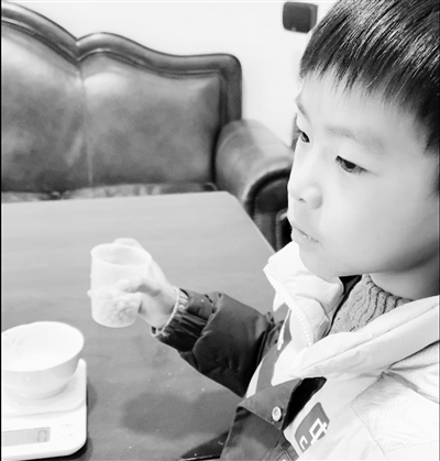 | 盛天宁在称量黄豆。 |