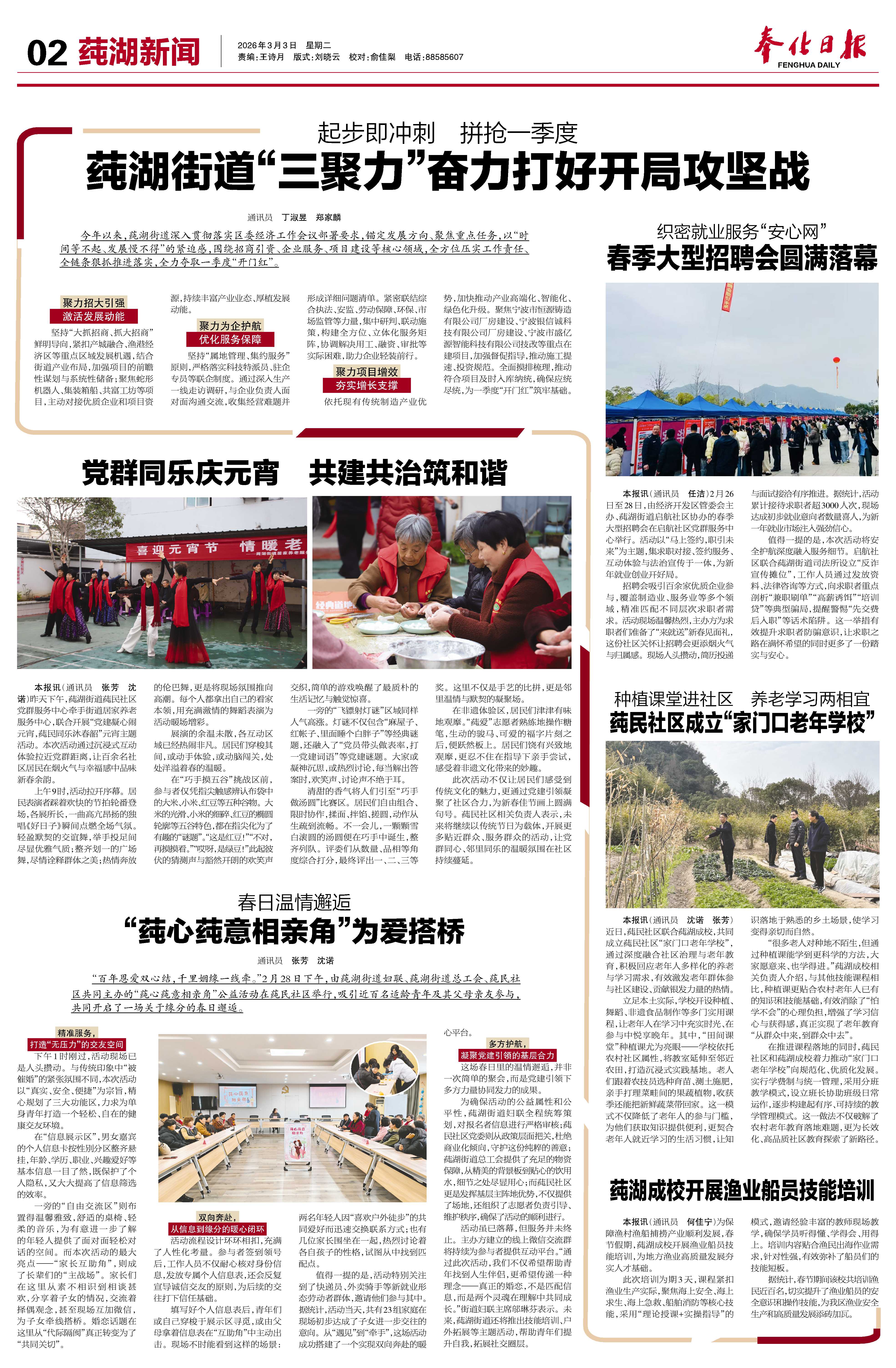 “百年恩爱双心结,千里姻缘一线牵。”2月28日下午,由莼湖街道妇联、莼湖街道总工会、莼民社区共同主办的“莼心莼意相亲角”公益活动在莼民社区举行,吸引近百名适龄青年及其父母亲友参与,共同开启了一场关于缘分的春日邂逅。