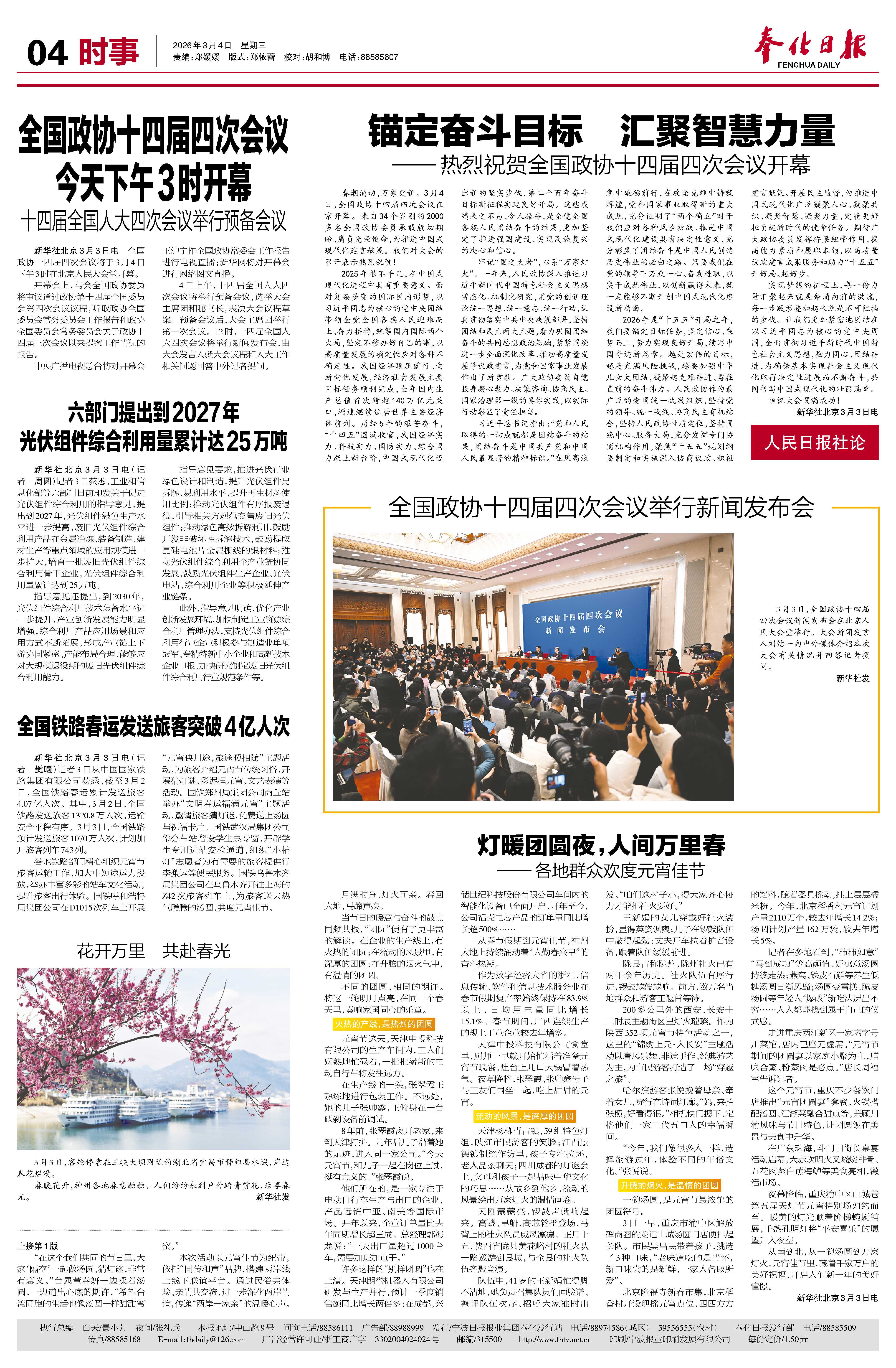 全国政协十四届四次会议今天下午3时开幕