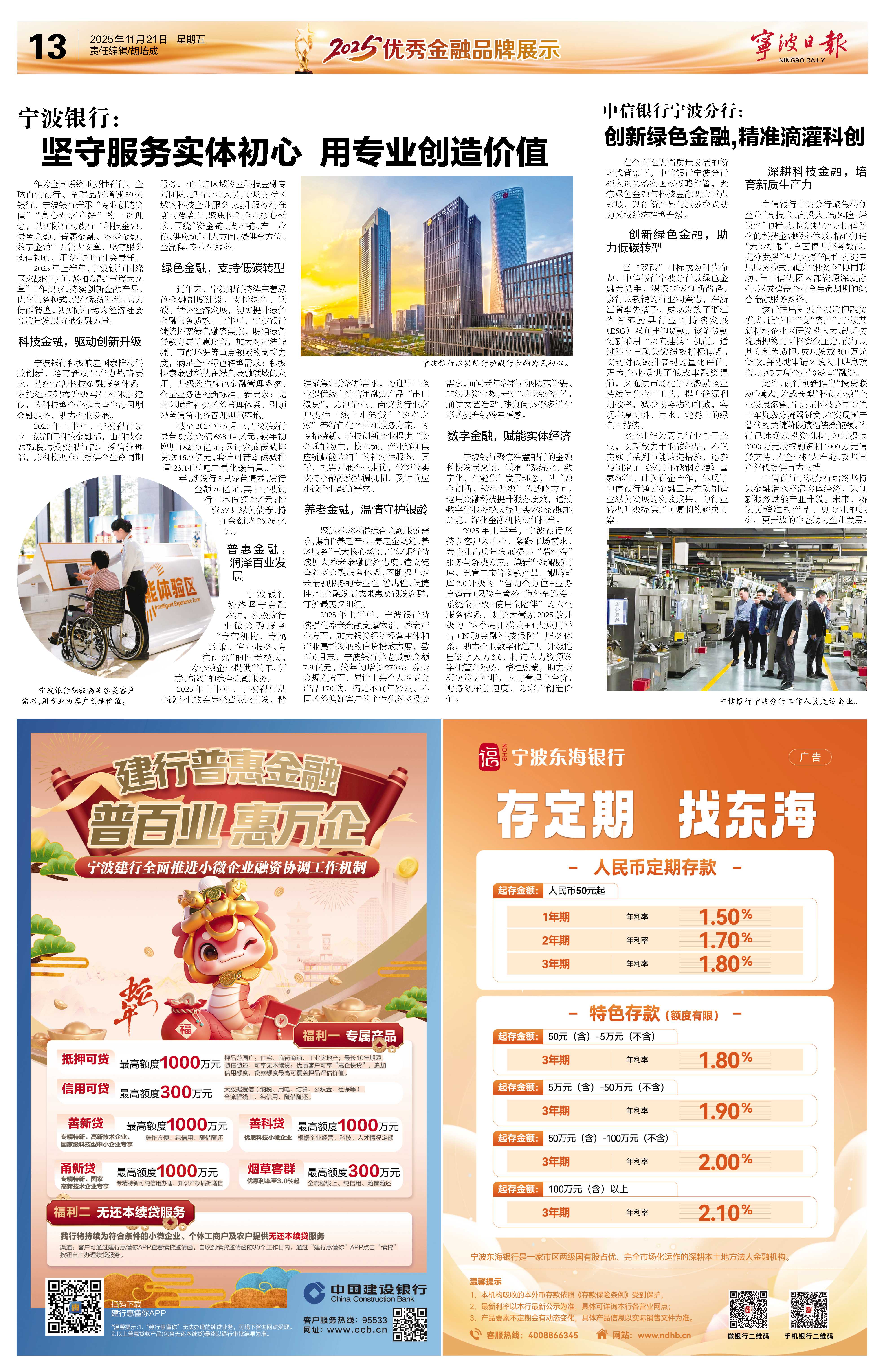 作为全国系统重要性银行、全球百强银行、全球品牌增速50强银行,宁波银行秉承“专业创造价值”“真心对客户好”的一贯理念,以实际行动践行“科技金融、绿色金融、普惠金融、养老金融、数字金融”五篇大文章,坚守服务实体初心,用专业担当社会责任。