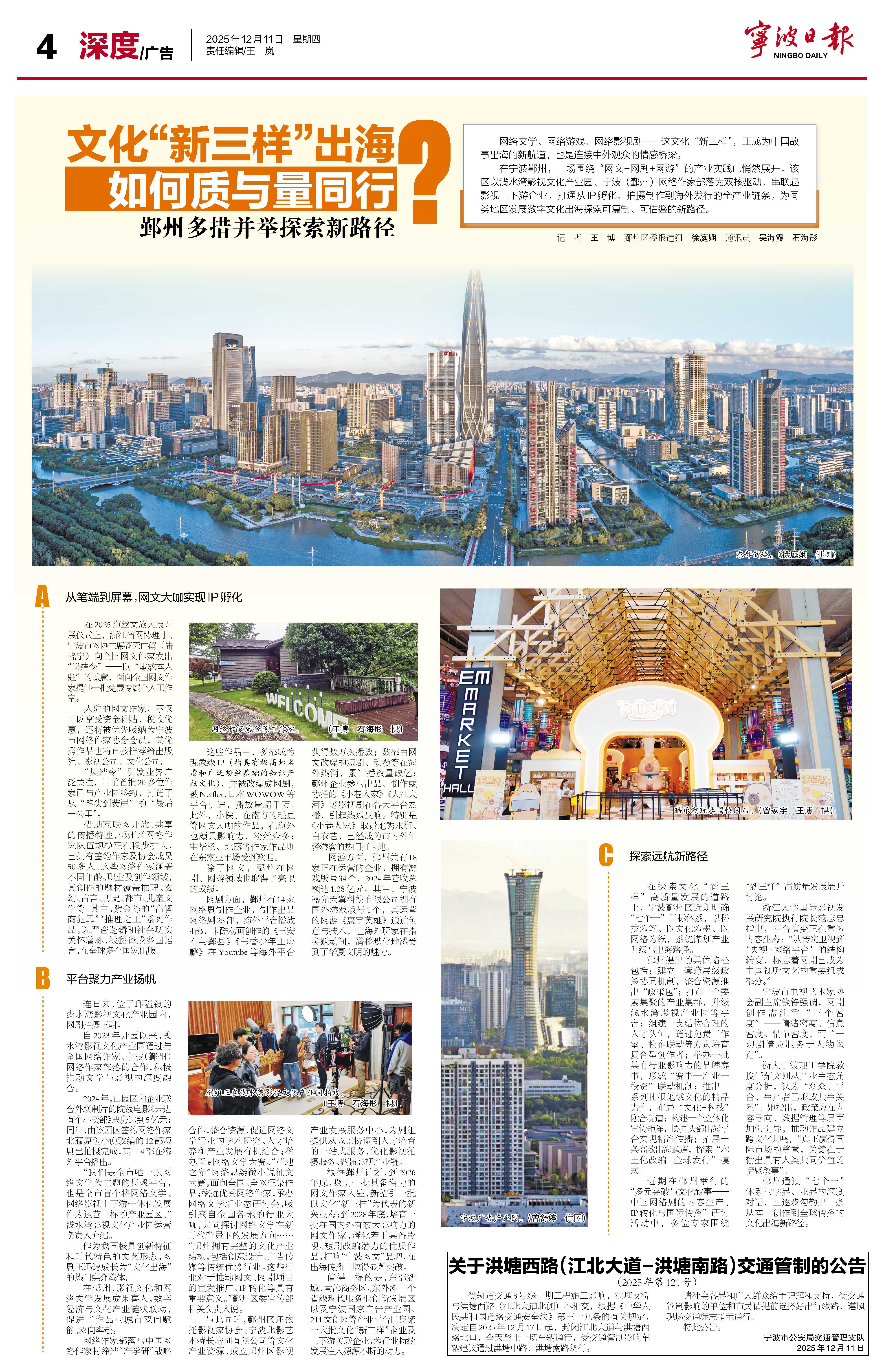 网络作家部落与中国网络作家村缔结“产学研”战略合作,整合资源,促进网络文学行业的学术研究、人才培养和产业发展有机结合;举办天e网络文学大赛、“堇地之光”网络悬疑微小说征文大赛,面向全国、全网征集作品;挖掘优秀网络作家,承办网络文学新业态研讨会,吸引来自全国各地的行业大咖,共同探讨网络文学在新时代背景下的发展方向……“鄞州拥有完整的文化产业结构,包括创意设计、广告传媒等传统优势行业。这些行业对于推动网文、网剧项目的宣发推广、IP转化等具有重要意义。”鄞州区委宣传部相关负责人说。