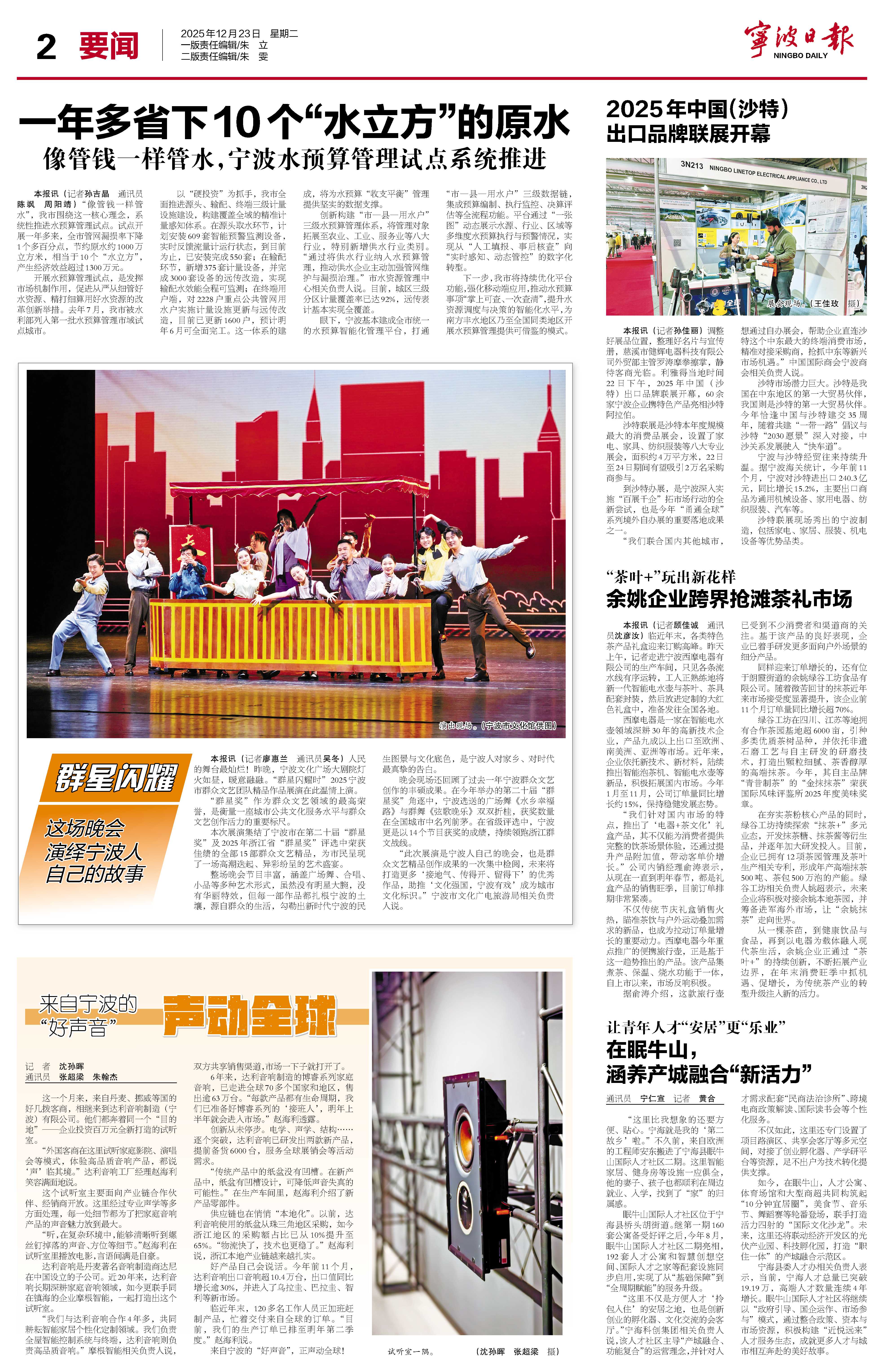 本报讯(记者廖惠兰 通讯员吴冬)人民的舞台最灿烂!昨晚,宁波文化广场大剧院灯火如昼,暖意融融。“群星闪耀时”2025宁波市群众文艺团队精品作品展演在此温情上演。
