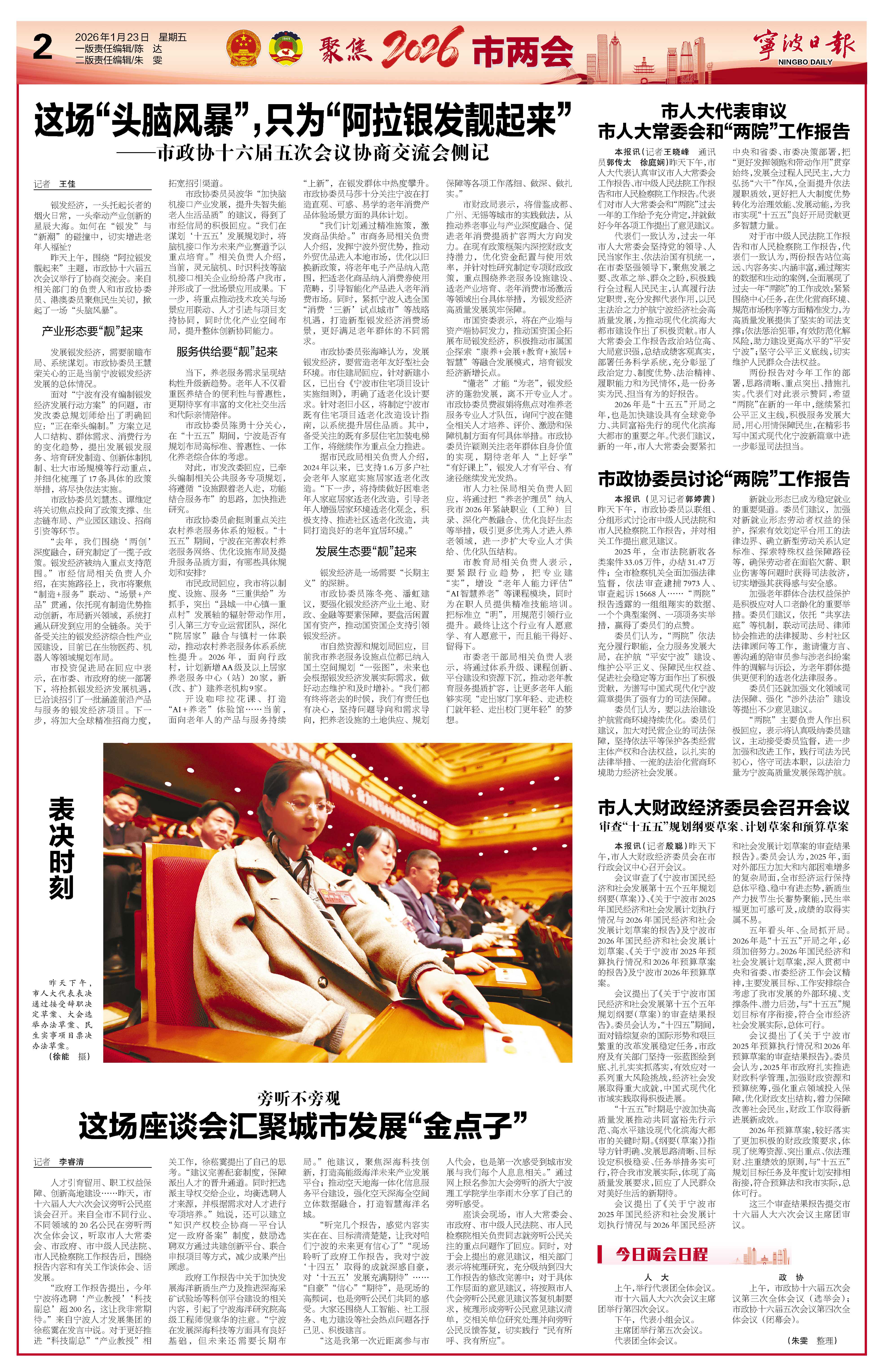 “听完几个报告,感觉内容实实在在、目标清清楚楚,让我对咱们宁波的未来更有信心了”“现场聆听了政府工作报告,我对宁波‘十四五’取得的成就深感自豪,对‘十五五’发展充满期待”……“自豪”“信心”“期待”,是现场的高频词,也是旁听公民们共同的感受。大家还围绕人工智能、社工服务、电力建设等社会热点问题各抒己见、积极建言。