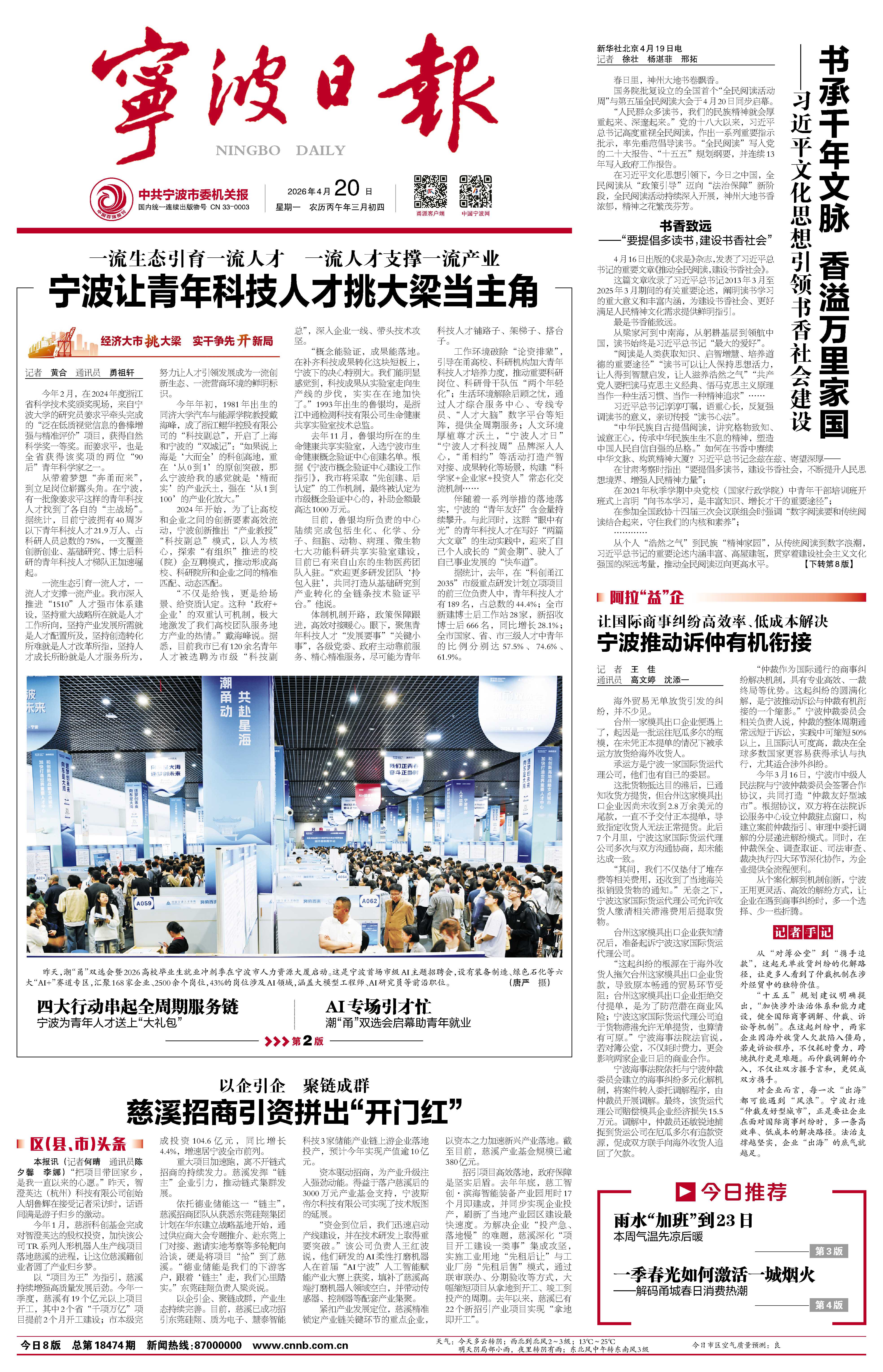 以“项目为王”为指引,慈溪持续增强高质量发展后劲。今年一季度,慈溪有19个亿元以上项目开工,其中2个省“千项万亿”项目提前2个月开工建设;市本级完成投资104.6亿元,同比增长4.4%,增速居宁波全市前列。