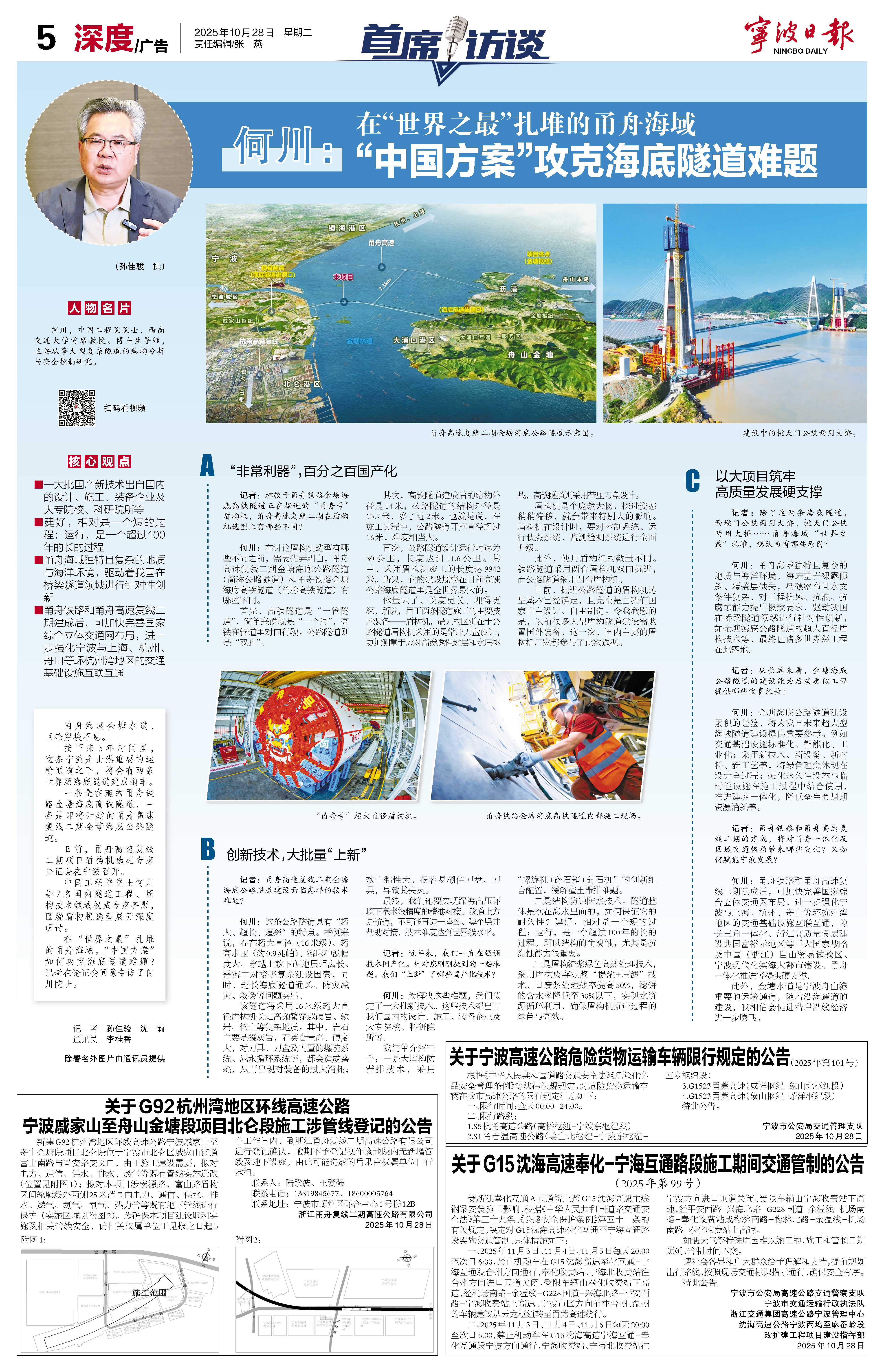 何川:在“世界之最”扎堆的甬舟海域 “中国方案”攻克海底隧道难题