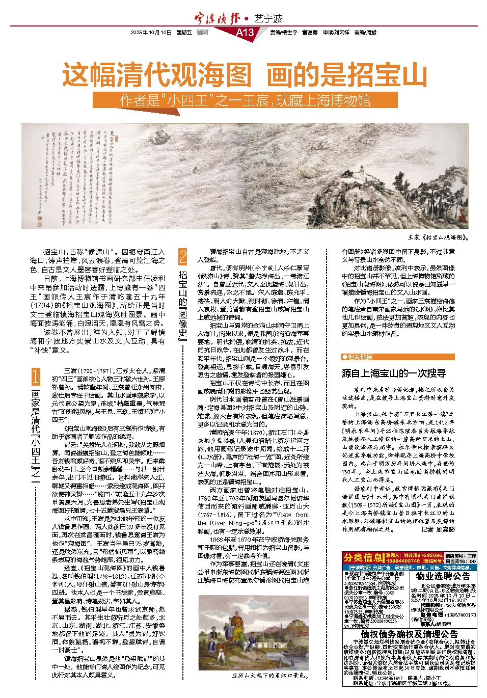据凌利中考证,故宫博物院藏有《吴门诸家图册》十六开,其中有明代吴门画家钱穀(1509-1572)所绘《宝山图》一页,表现的是今上海高桥镇宝山昔日扼守长江口的山水形胜,与镇海招宝山的地理位置及发挥的作用颇有相似之处。记者 顾嘉懿