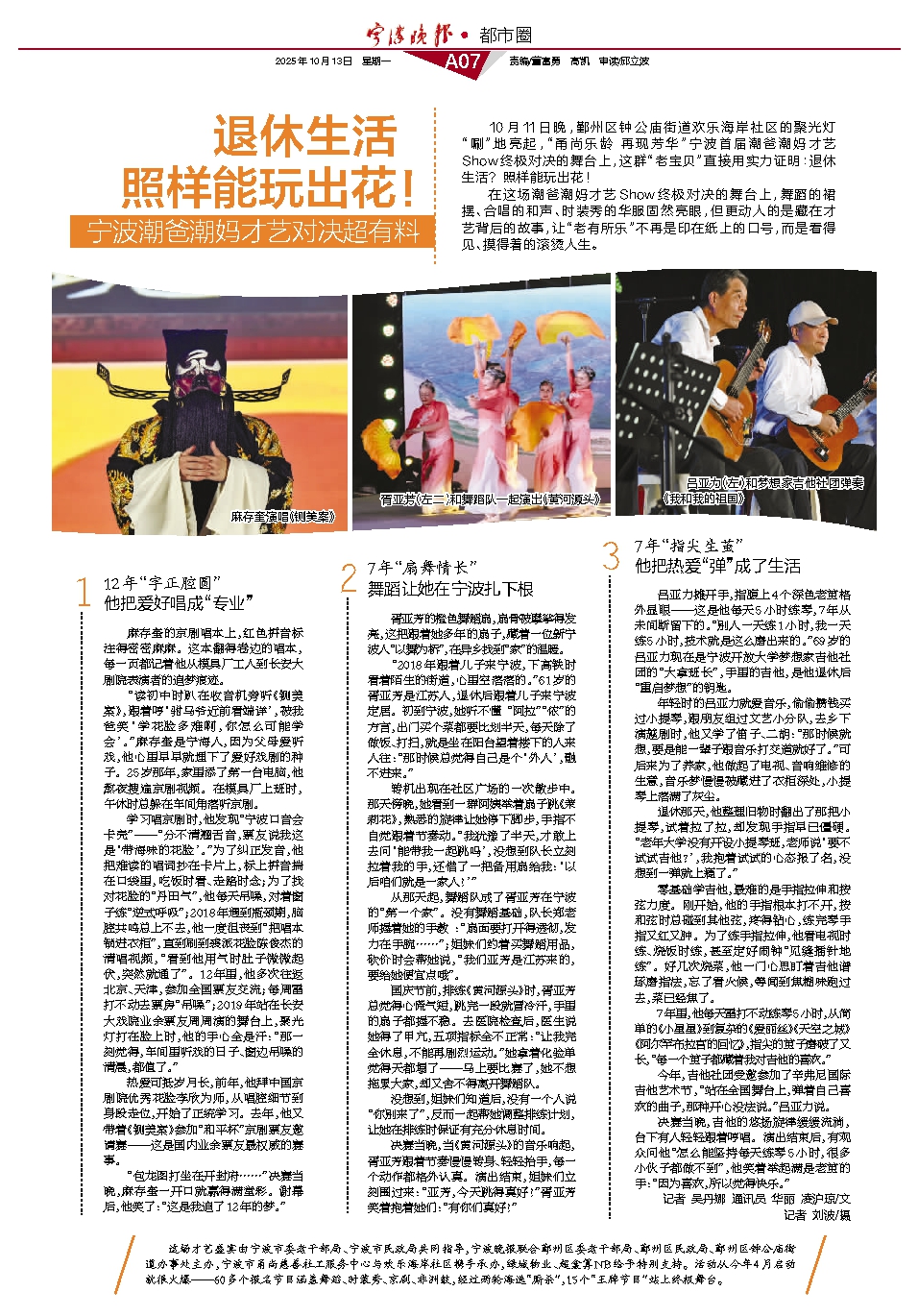 10月11日晚,鄞州区钟公庙街道欢乐海岸社区的聚光灯“唰”地亮起,“甬尚乐龄 再现芳华”宁波首届潮爸潮妈才艺Show终极对决的舞台上,这群“老宝贝”直接用实力证明:退休生活?照样能玩出花!