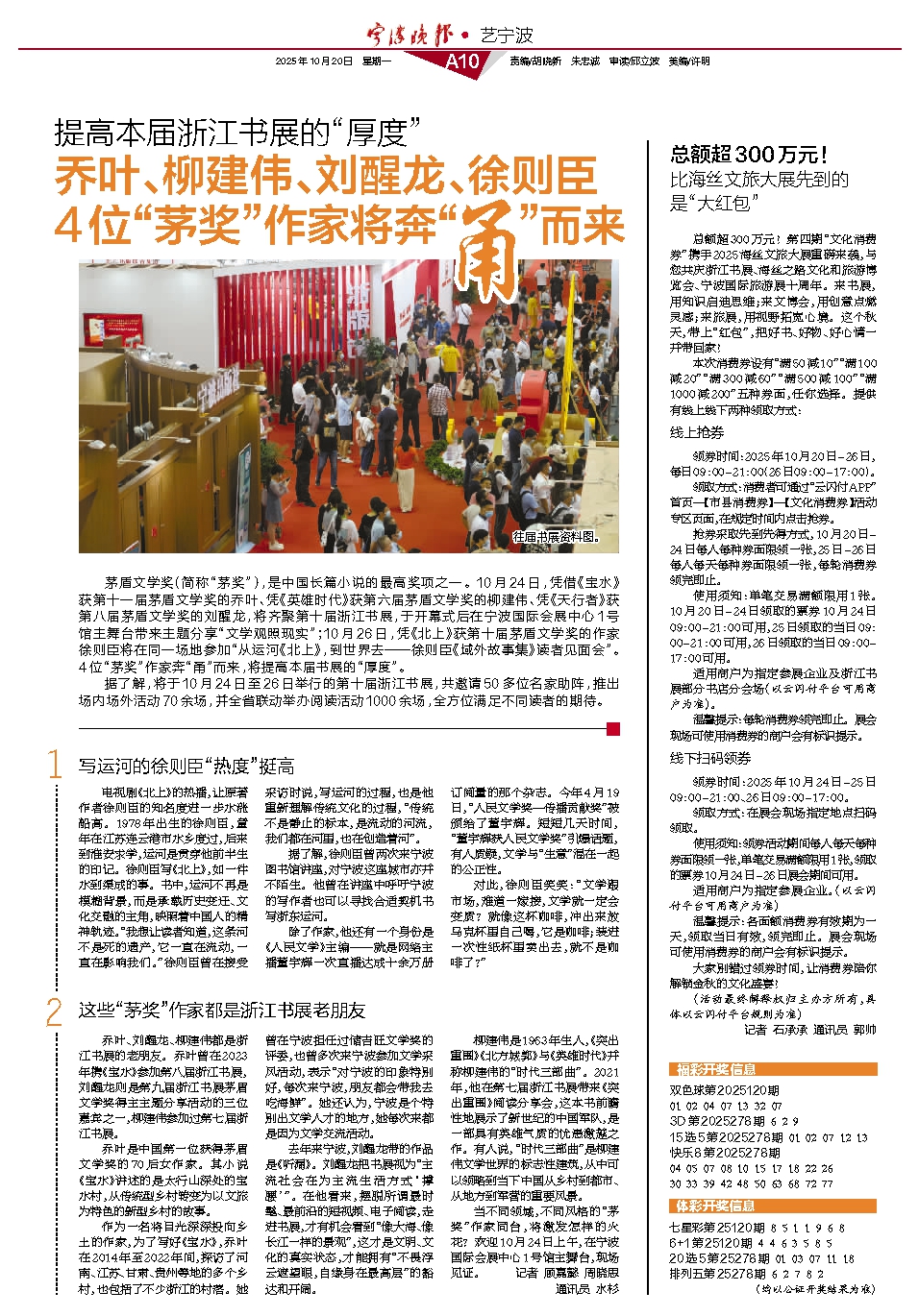 总额超300万元!第四期“文化消费券”携手2025海丝文旅大展重磅来袭,与您共庆浙江书展、海丝之路文化和旅游博览会、宁波国际旅游展十周年。来书展,用知识启迪思维;来文博会,用创意点燃灵感;来旅展,用视野拓宽心境。这个秋天,带上“红包”,把好书、好物、好心情一并带回家!