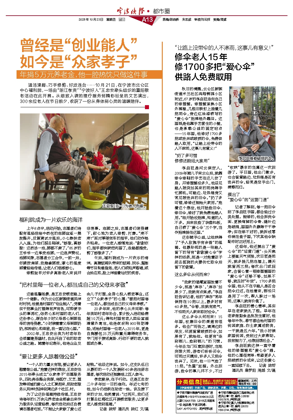 李启旺是河北保定人,2009年随儿子来北仑后,就靠修伞修鞋的手艺在这儿安了身。开修理铺没多久,他总见路人被突如其来的雨浇得手忙脚乱,可路边、垃圾桶旁又常见被丢弃的旧伞。“扔了多可惜,修修还能给大家用。”抱着这个想法,他开始捡旧伞、修旧伞,修好了就免费给路人用。“刚开始没招牌,知道的人不多。后来我捡了块塑料板,自己喷了‘爱心伞’三个字,当作招牌挂在这里。”
