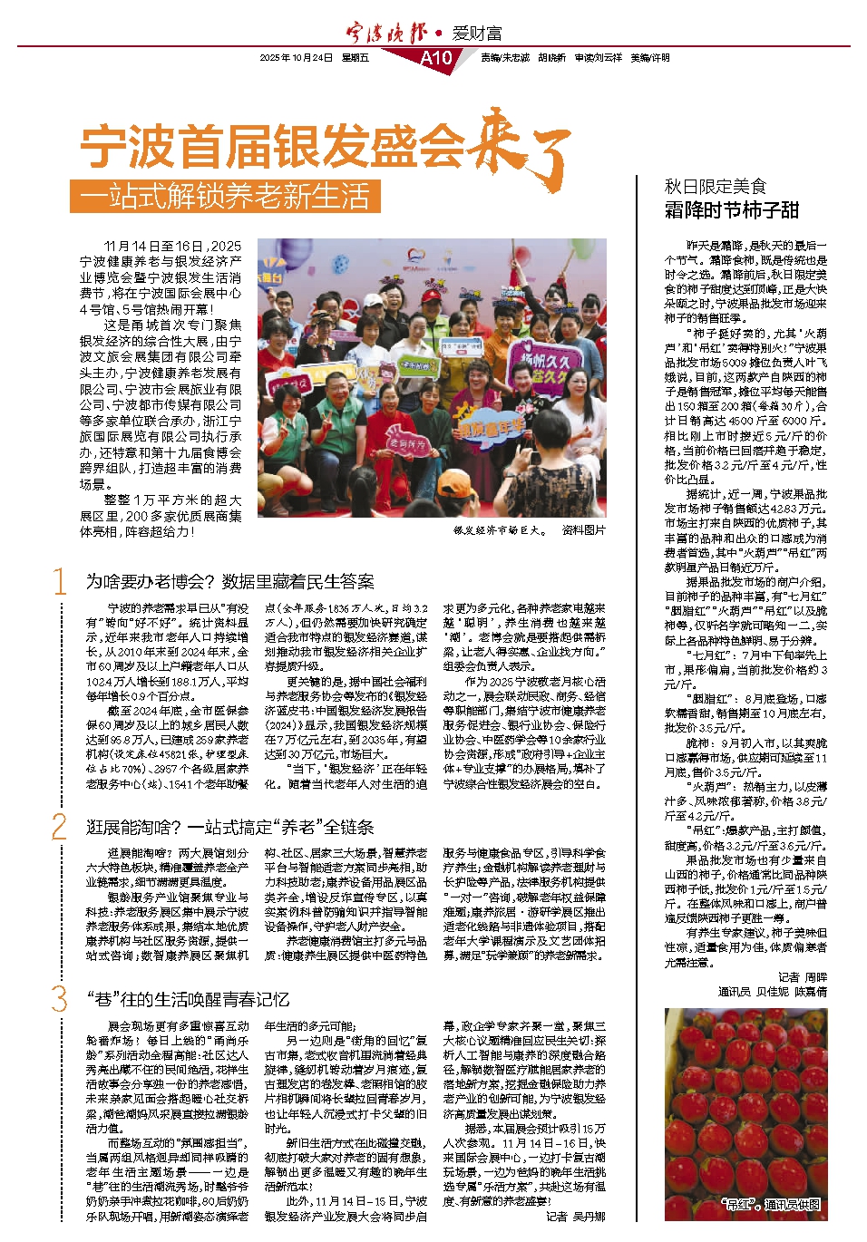 此外,11月14日-15日,宁波银发经济产业发展大会将同步启幕,政企学专家齐聚一堂,聚焦三大核心议题精准回应民生关切:探析人工智能与康养的深度融合路径,解锁数智医疗赋能居家养老的落地新方案,挖掘金融保险助力养老产业的创新可能,为宁波银发经济高质量发展出谋划策。