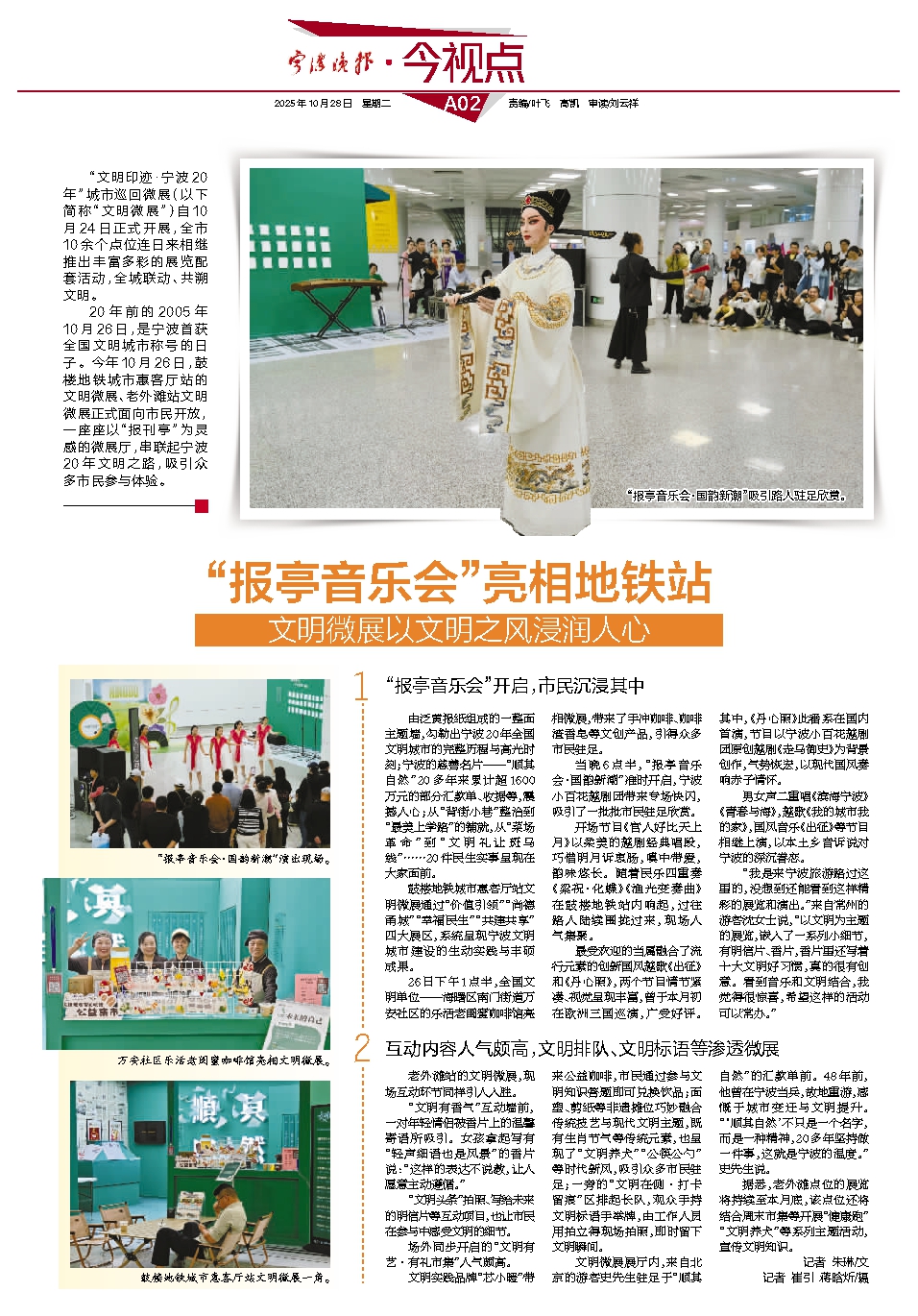 20年前的2005年10月26日,是宁波首获全国文明城市称号的日子。今年10月26日,鼓楼地铁城市惠客厅站的文明微展、老外滩站文明微展正式面向市民开放,一座座以“报刊亭”为灵感的微展厅,串联起宁波20年文明之路,吸引众多市民参与体验。