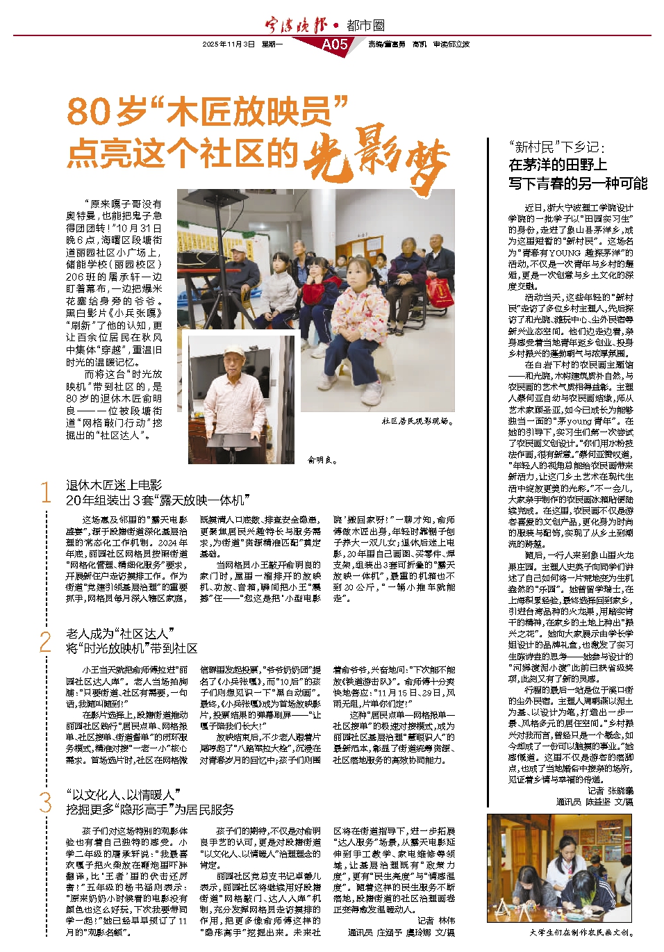 而将这台“时光放映机”带到社区的,是80岁的退休木匠俞明良——一位被段塘街道“网格敲门行动”挖掘出的“社区达人”。