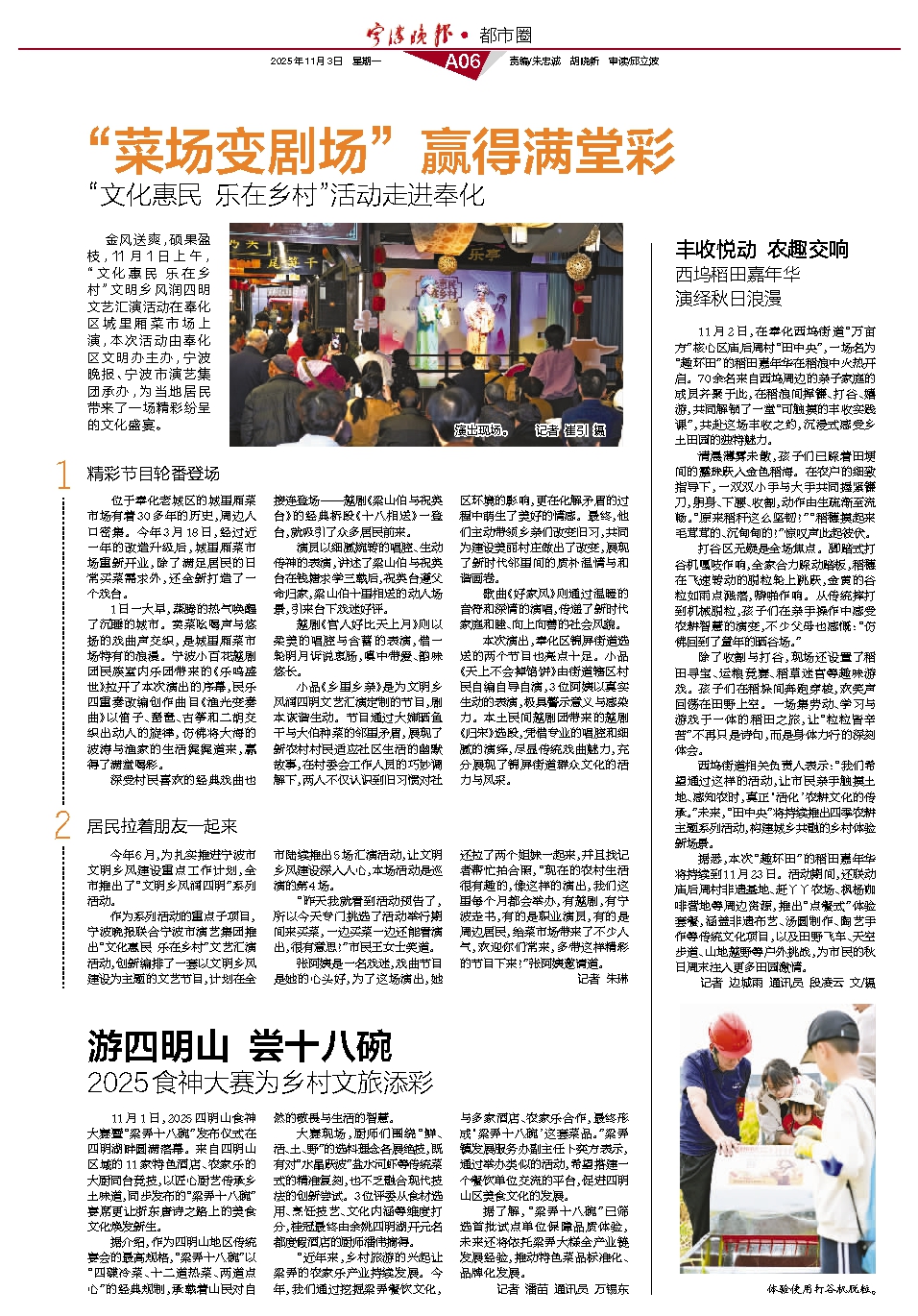 11月2日,在奉化西坞街道“万亩方”核心区庙后周村“田中央”,一场名为“趣环田”的稻田嘉年华在稻浪中火热开启。70余名来自西坞周边的亲子家庭的成员齐聚于此,在稻浪间挥镰、打谷、嬉游,共同解锁了一堂“可触摸的丰收实践课”,共赴这场丰收之约,沉浸式感受乡土田园的独特魅力。