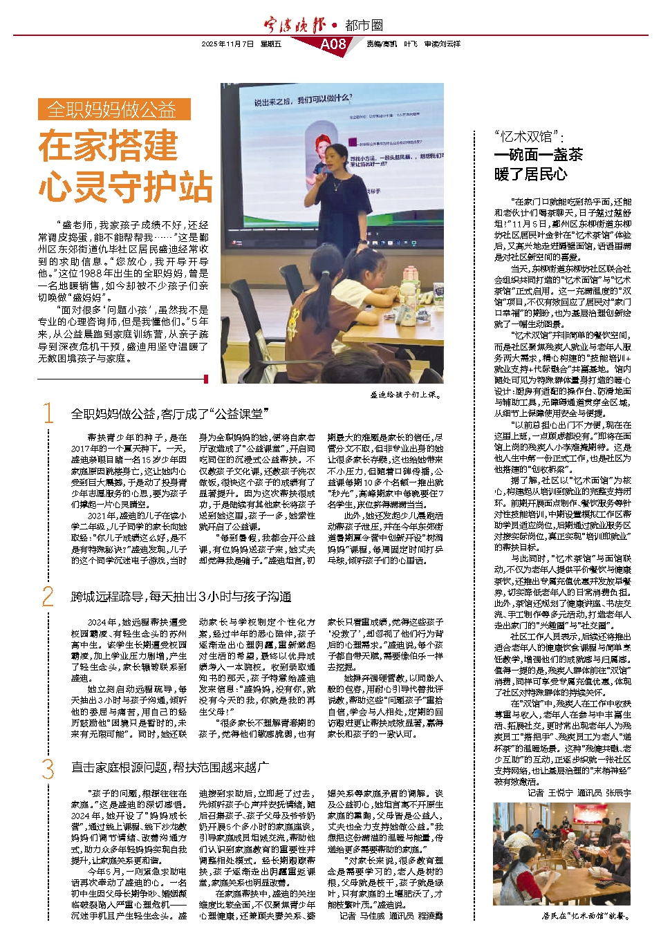 在家庭帮扶中,盛迪的关注维度比较全面,不仅聚焦青少年心理健康,还兼顾夫妻关系、婆媳关系等家庭矛盾的调解。谈及公益初心,她坦言离不开原生家庭的熏陶,父母皆是公益人,丈夫也全力支持她做公益。“我想把这份满溢的温暖与能量,传递给更多需要帮助的家庭。”