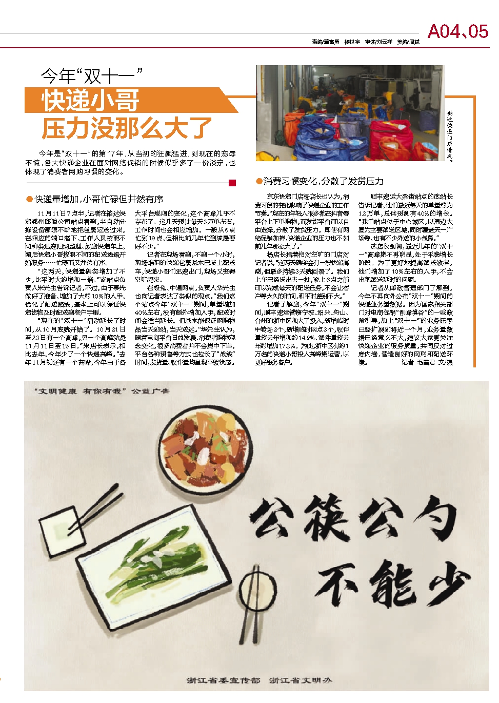 记者了解到,今年“双十一”期间,顺丰速运管辖宁波、绍兴、舟山、台州的浙中区加大了投入,新增临时中转场2个,新增临时网点3个,收件量较去年增加约14.9%、派件量较去年约增加17.2%。为此,浙中区有约1万名的快递小哥投入高峰期运营,以更好服务客户。