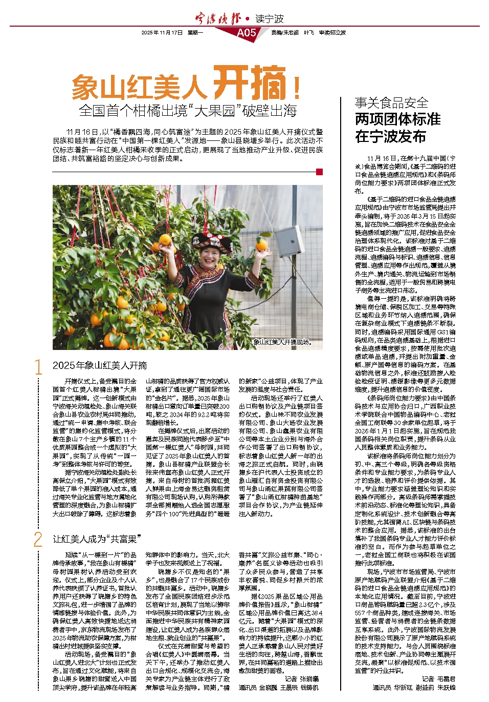 11月16日,以“橘香飘四海,同心筑富途”为主题的2025年象山红美人开摘仪式暨民族和睦共富行动在“中国第一棵红美人”发源地——象山县晓塘乡举行。此次活动不仅标志着新一年红美人柑橘采收季的正式启动,更展现了当地推动产业升级、促进民族团结、共筑富裕路的坚定决心与创新成果。