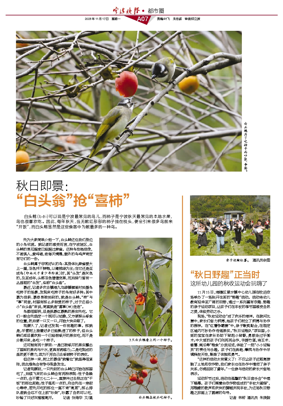 最近,记者多次去镇海九龙湖镇横溪村拍摄鸟吃柿子的场景,发现来吃柿子的鸟有好多种;其中最为活跃、最容易被拍到的,就是白头鹎。“柿”与“事”同音,村里有那么多甜美的柿子,对于这些小小“白头翁”来说,简直就是“喜事(柿)连连”。