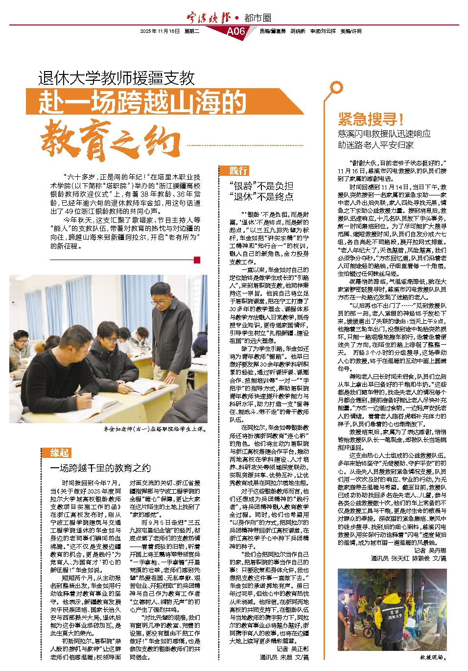时间拨回到今年7月,当《关于做好2025年度阿拉尔大学城高校银龄教师支教项目实施工作的函》在浙江高校发布时,刚从宁波工程学院建筑与交通工程学院退休的车金如与身边的老同事们瞬间热血沸腾。“这不仅是支援边疆教育的机会,更是践行‘为党育人、为国育才’初心的新征程!”车金如说。