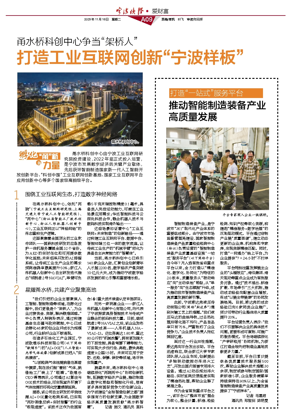 智能制造装备产业,是宁波市“361”现代化产业体系的重要组成部分。由宁波市市场监督管理局建设、国家智能制造装备产品质量检验检测中心(浙江)负责运营的“智能制造装备产业质量基础设施‘一站式’服务平台”(以下简称平台)自今年7月入选首批省级重点平台以来,全力打造以“精准化、数字化、协同化”为特征的2.0版本,质量服务从“被动响应”向“主动供给”转型,从“单一服务”向“生态赋能”升级,成为推动我市智能制造装备产业高质量发展的新引擎。