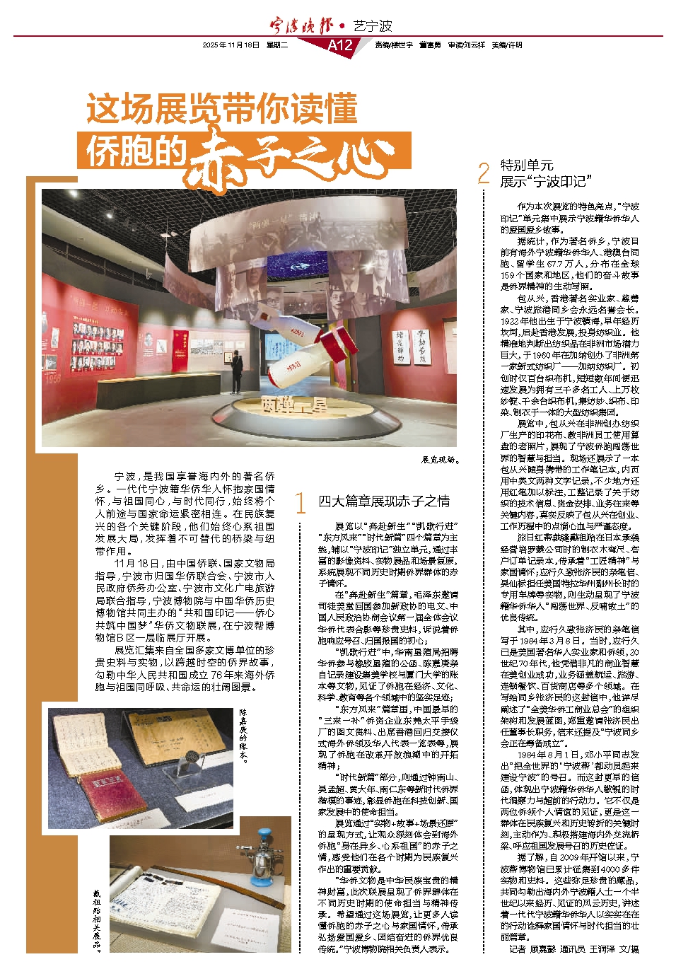 作为本次展览的特色亮点,“宁波印记”单元集中展示宁波籍华侨华人的爱国爱乡故事。