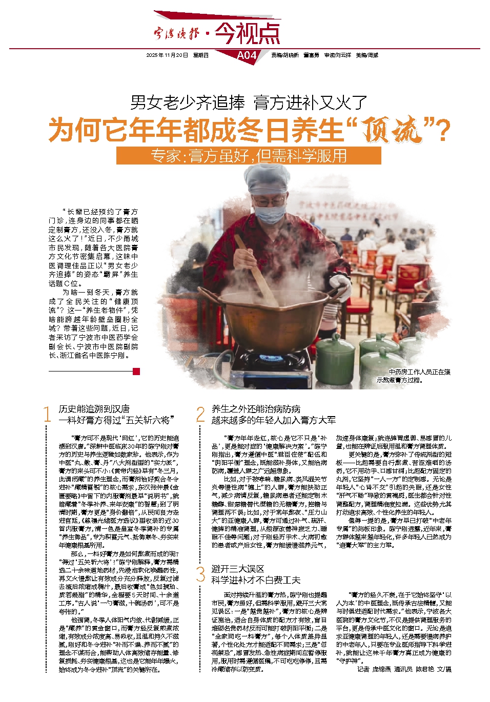 “膏方的经久不衰,在于它始终坚守‘以人为本’的中医理念,既传承古法精髓,又能与时俱进适配时代需求。”他表示,宁波各大医院的膏方文化节,不仅是提供调理服务的平台,更是传承中医文化的窗口。无论是追求亚健康调理的年轻人,还是需要慢病养护的中老年人,只要在专业医师指导下科学进补,就能让这味千年膏方真正成为健康的“守护神”。