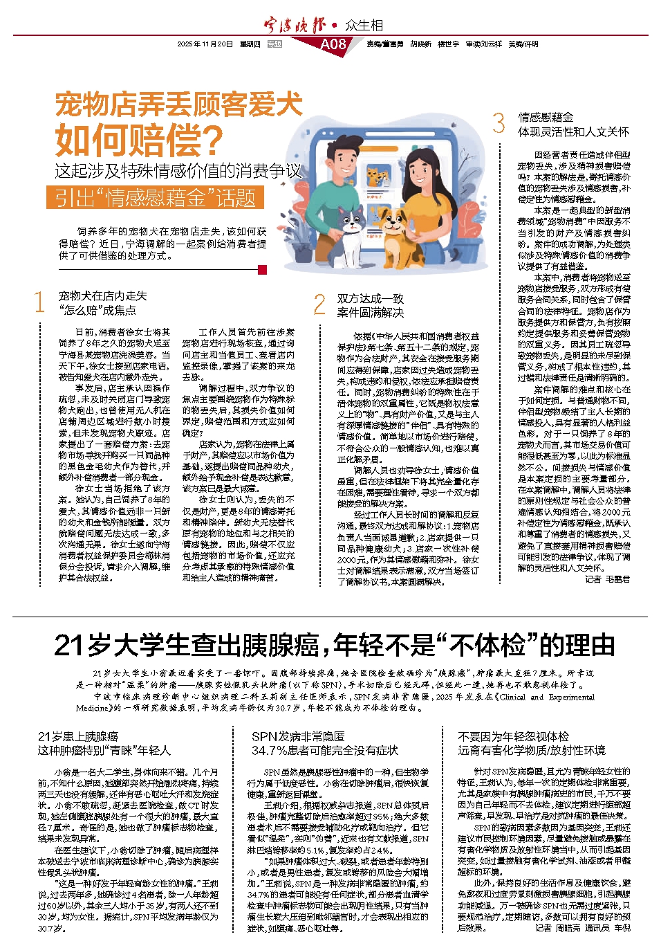 21岁女大学生小翁最近着实受了一番惊吓。因腹部持续疼痛,她去医院检查被确诊为“胰腺癌”,肿瘤最大直径7厘米。所幸这是一种相对“温柔”的肿瘤——胰腺实性假乳头状肿瘤(以下称SPN),手术切除后已经无碍,但经此一遭,她再也不敢忽视体检了。