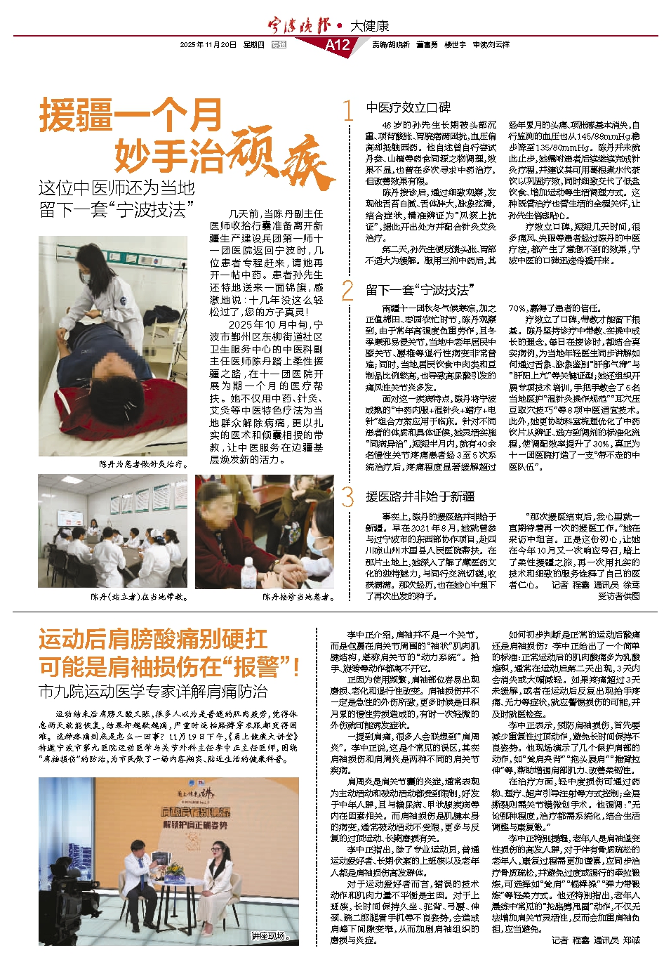 运动结束后肩膀又酸又胀,很多人以为是普通的肌肉疲劳,觉得休息两天就能恢复,结果却越歇越痛,严重时连抬胳膊穿衣服都变得困难。这种疼痛到底是怎么一回事?11月19日下午,《甬上健康大讲堂》特邀宁波市第九医院运动医学与关节外科主任李中正主任医师,围绕“肩袖损伤”的防治,为市民做了一场内容翔实、贴近生活的健康科普。