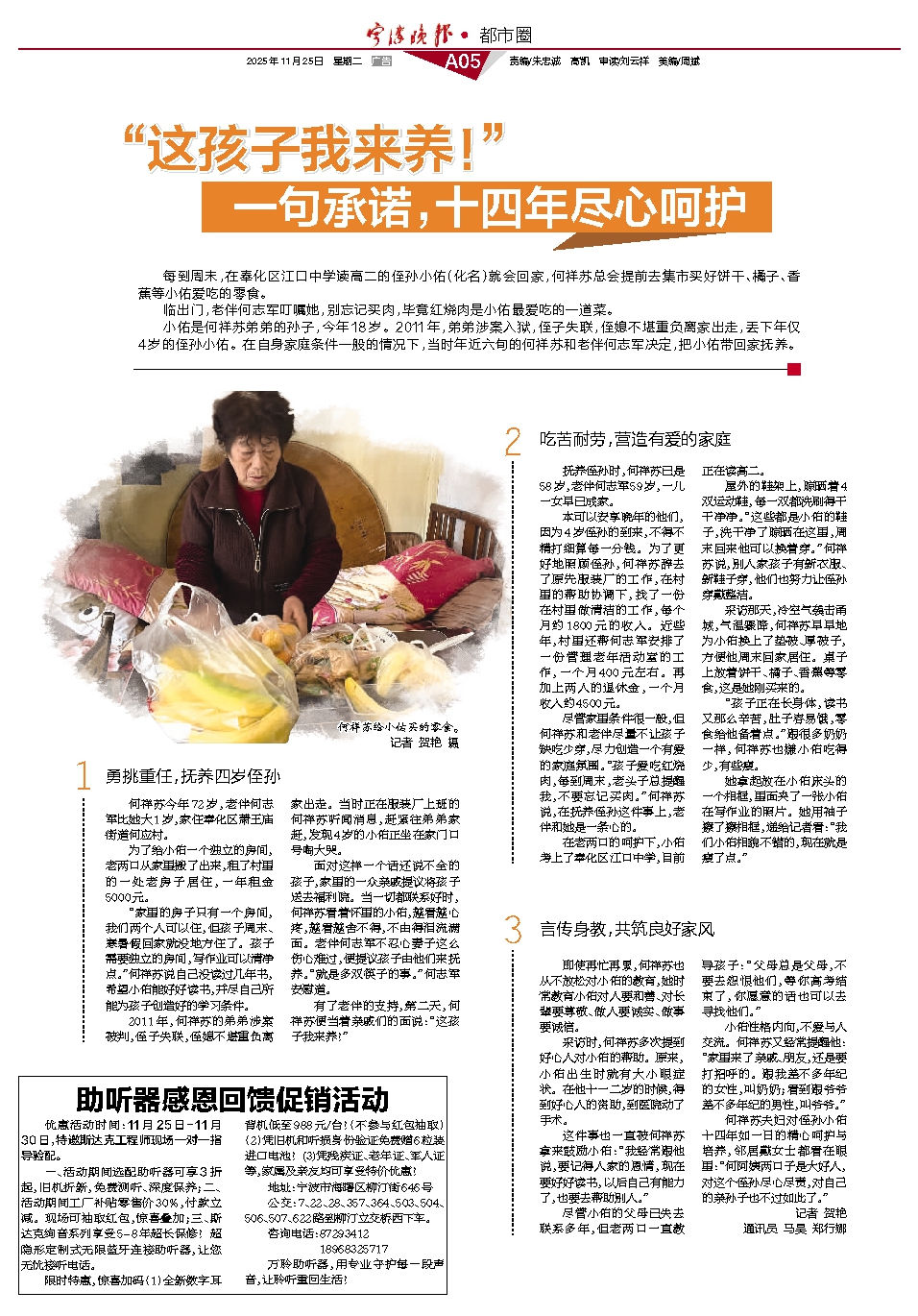 每到周末,在奉化区江口中学读高二的侄孙小佑(化名)就会回家,何祥苏总会提前去集市买好饼干、橘子、香蕉等小佑爱吃的零食。