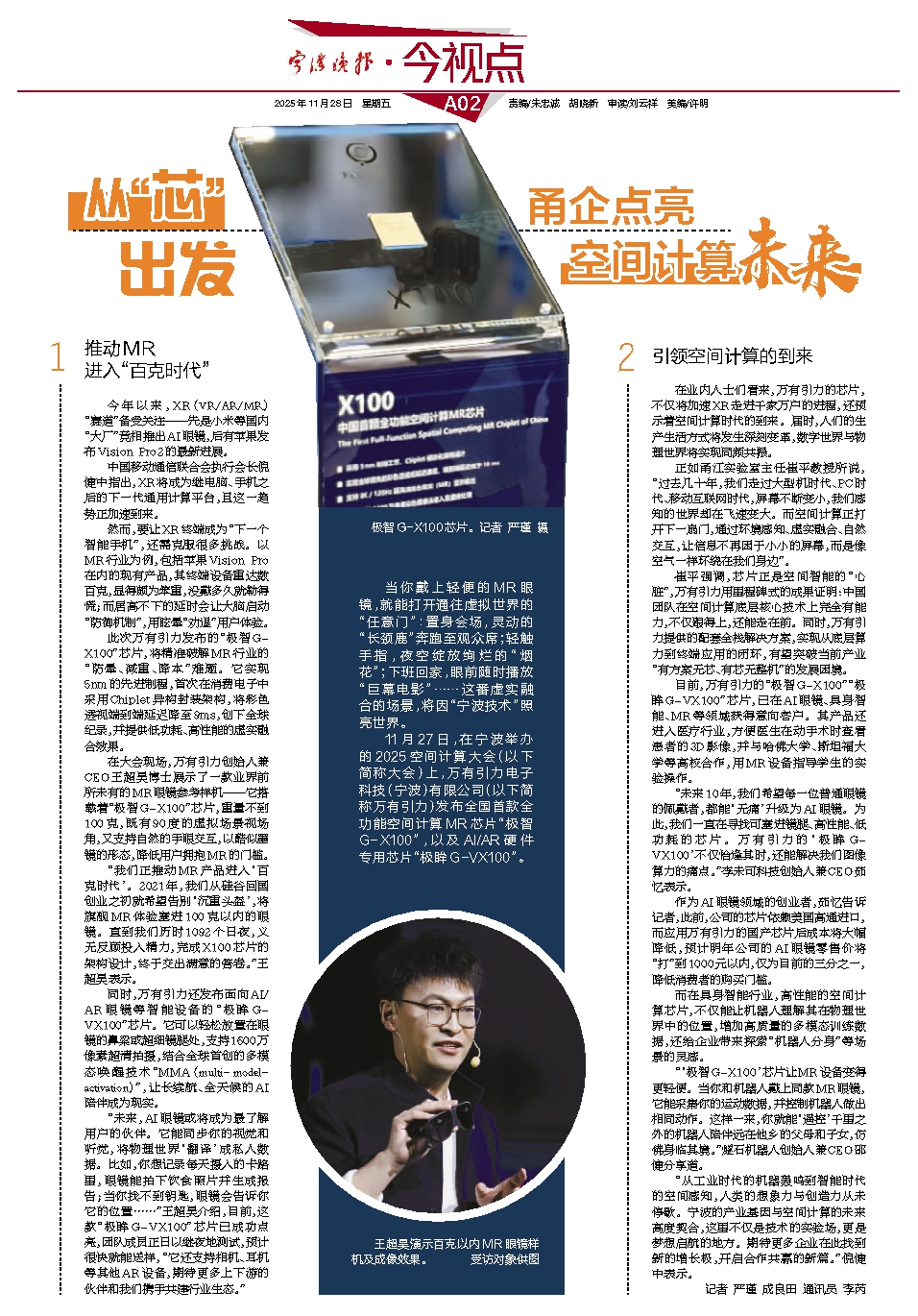 “我们正推动MR产品进入‘百克时代’。2021年,我们从硅谷回国创业之初就希望告别‘沉重头盔’,将旗舰MR体验塞进100克以内的眼镜。直到我们历时1092个日夜,义无反顾投入精力,完成X100芯片的架构设计,终于交出满意的答卷。”王超昊表示。