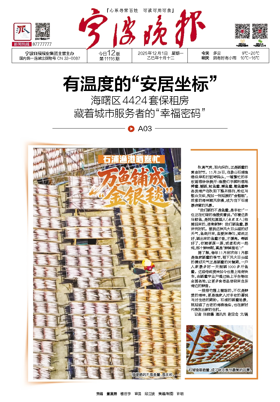 秋高气爽,阳光炽烈,正是晒鲞的黄金时节。11月29日,在象山石浦渔港沿岸和打鼓峙码头,一幅繁忙的丰收画卷徐徐展开:渔嫂们手脚利落地劈鲞、铺晒,鱿鱼鲞、鳗鱼鲞、鲳鱼鲞等各类海产在秋阳下整齐排列,粉红与银白交织,宛如一张延展的“金银毯”,浓郁的海味随风弥漫,成为当下石浦最诗意的风景。