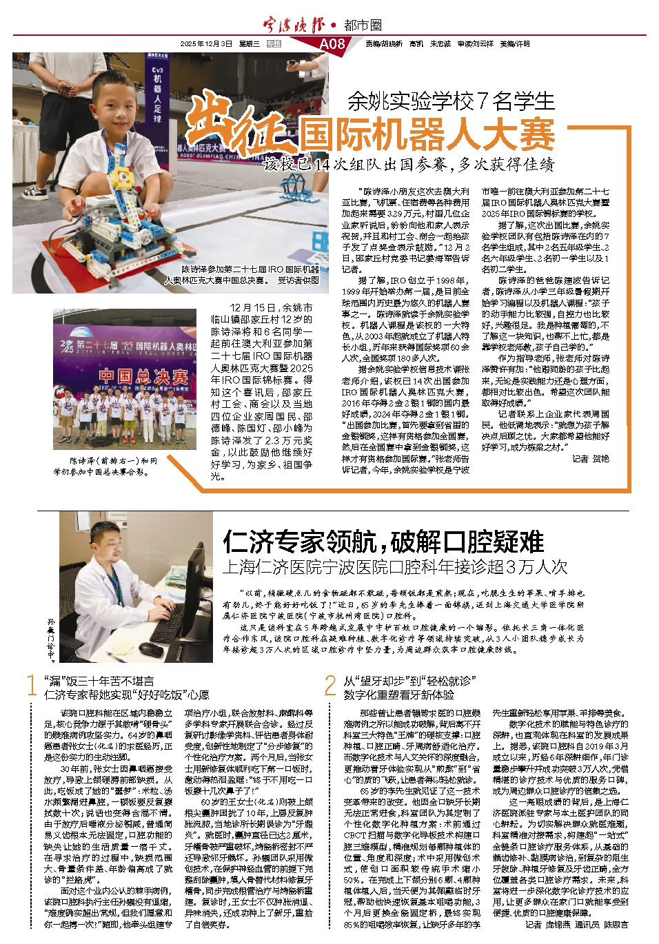 据余姚实验学校信息技术课张老师介绍,该校已14次出国参加IRO国际机器人奥林匹克大赛,2016年夺得2金2银1铜的国内最好成绩,2024年夺得2金1银1铜。“出国参加比赛,首先要拿到省里的金银铜奖,这样有资格参加全国赛,然后在全国赛中拿到金银铜奖,这样才有资格参加国际赛。”张老师告诉记者,今年,余姚实验学校是宁波市唯一前往澳大利亚参加第二十七届IRO国际机器人奥林匹克大赛暨2025年IRO国际锦标赛的学校。