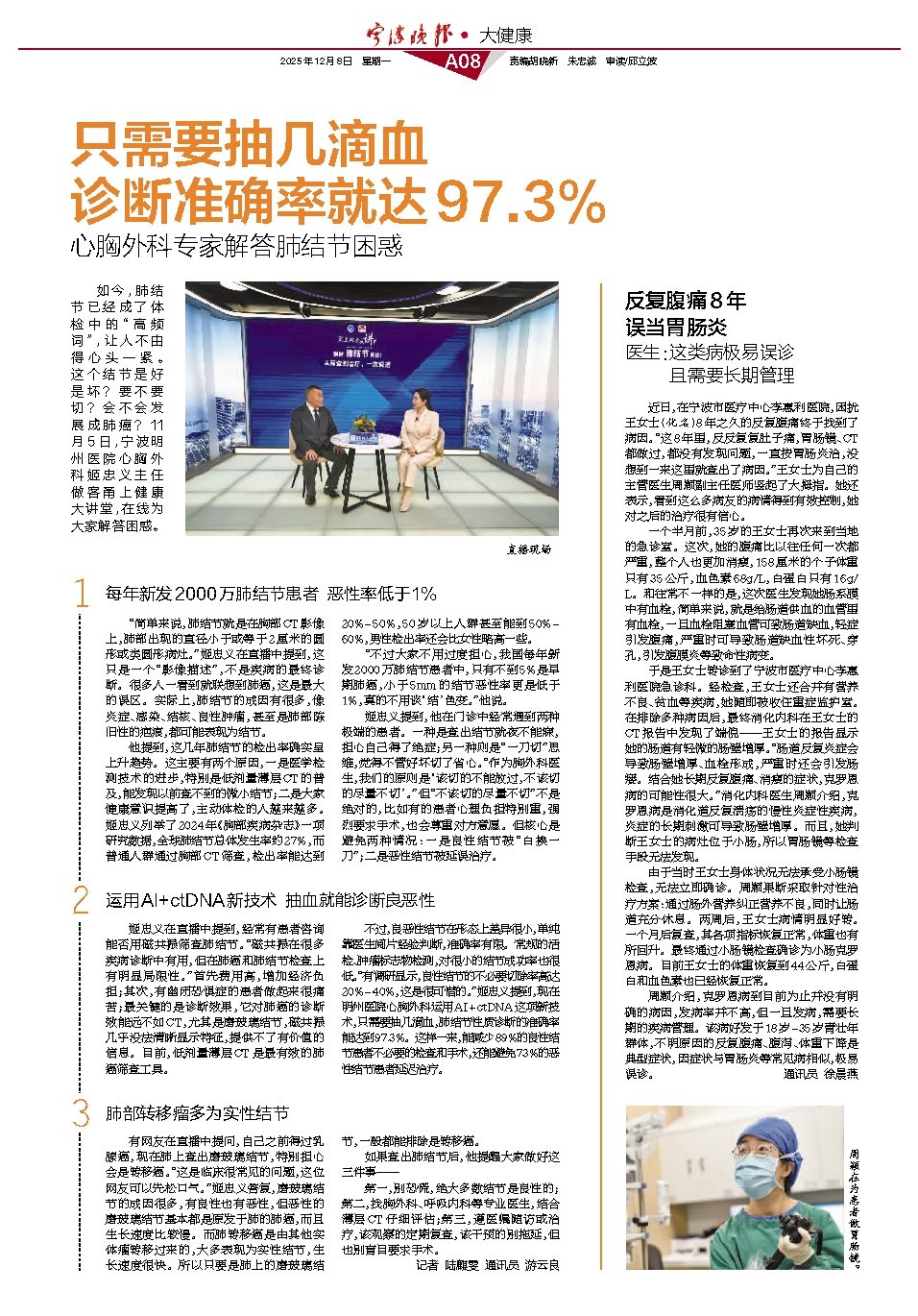 近日,在宁波市医疗中心李惠利医院,困扰王女士(化名)8年之久的反复腹痛终于找到了病因。“这8年里,反反复复肚子痛,胃肠镜、CT都做过,都没有发现问题,一直按胃肠炎治,没想到一来这里就查出了病因。”王女士为自己的主管医生周颖副主任医师竖起了大拇指。她还表示,看到这么多病友的病情得到有效控制,她对之后的治疗很有信心。