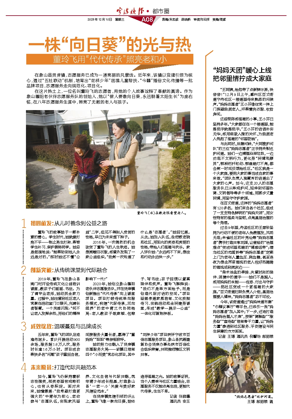 如今,董玲飞仍保持着标志性微笑,那笑容里有纯粹初心,也有从容积淀。面对未来,她憧憬道:“我希望打造更强大的‘中青年为核心、老幼参与’志愿队伍,实现家风涵养、文化自信与代际共融,筑牢青少年成长根基,打造象山县‘一老一小’关爱与美好家风建设范本。”