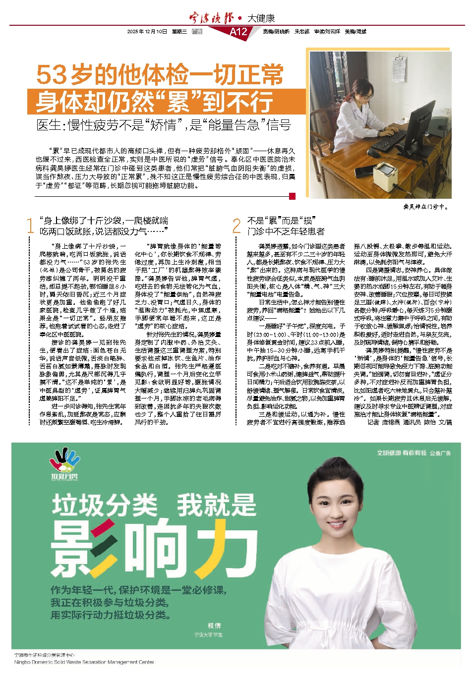“身上像绑了十斤沙袋,一爬楼就喘,吃两口饭就胀,说话都没力气……”53岁的张先生(化姓)是公司骨干,被莫名的疲劳感纠缠了两年。明明没干重活,却总提不起劲,哪怕睡足8小时,隔天依旧昏沉;近三个月症状更是加重。他偷偷跑了好几家医院,检查几乎做了个遍,结果全是“一切正常”。经朋友推荐,他抱着试试看的心态,走进了奉化区中医医院。