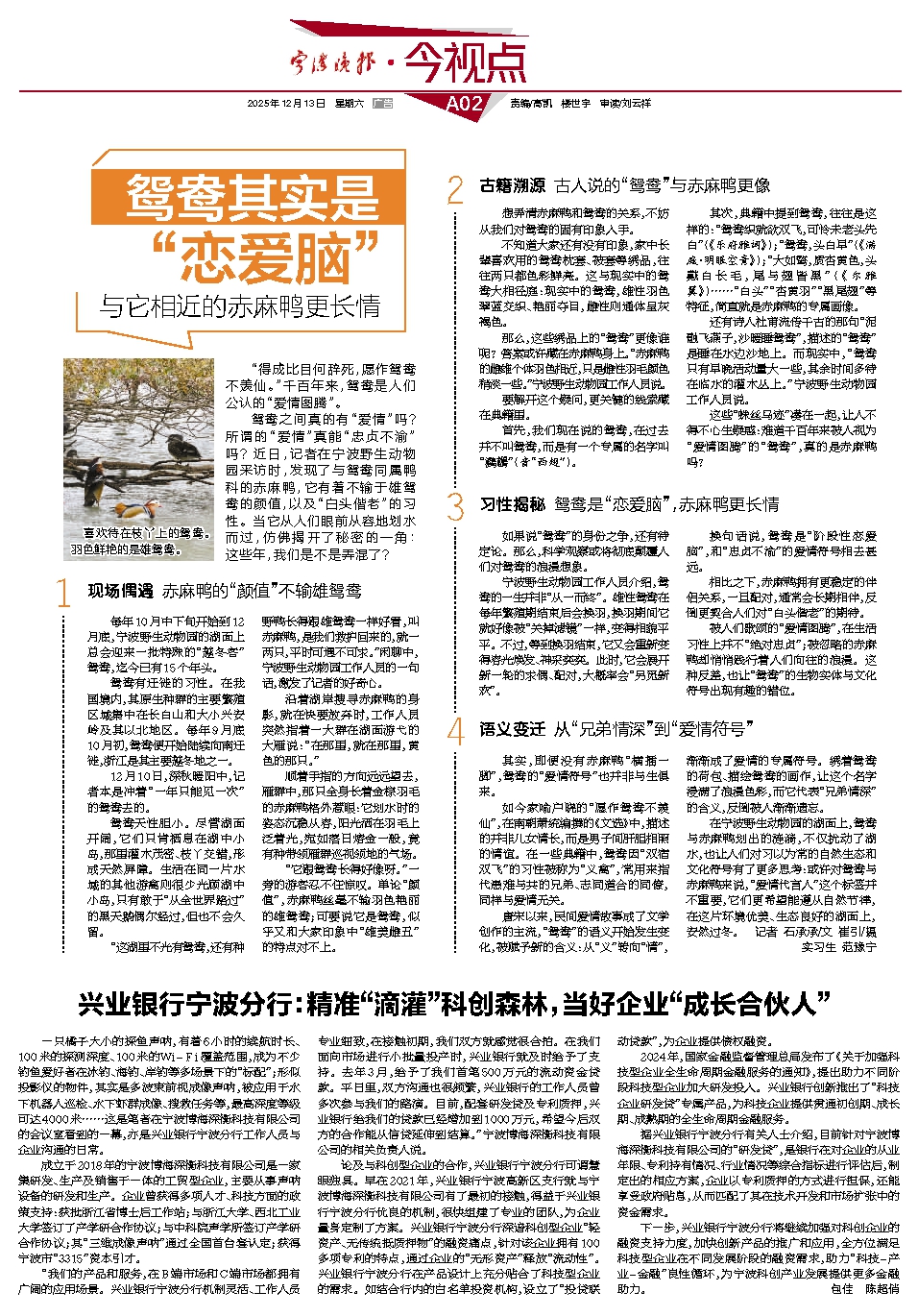 在宁波野生动物园的湖面上,鸳鸯与赤麻鸭划出的涟漪,不仅扰动了湖水,也让人们对习以为常的自然生态和文化符号有了更多思考:或许对鸳鸯与赤麻鸭来说,“爱情代言人”这个标签并不重要,它们更希望能遵从自然节律,在这片环境优美、生态良好的湖面上,安然过冬。记者 石承承/文 崔引/摄
